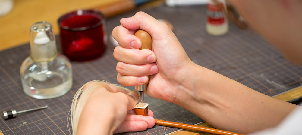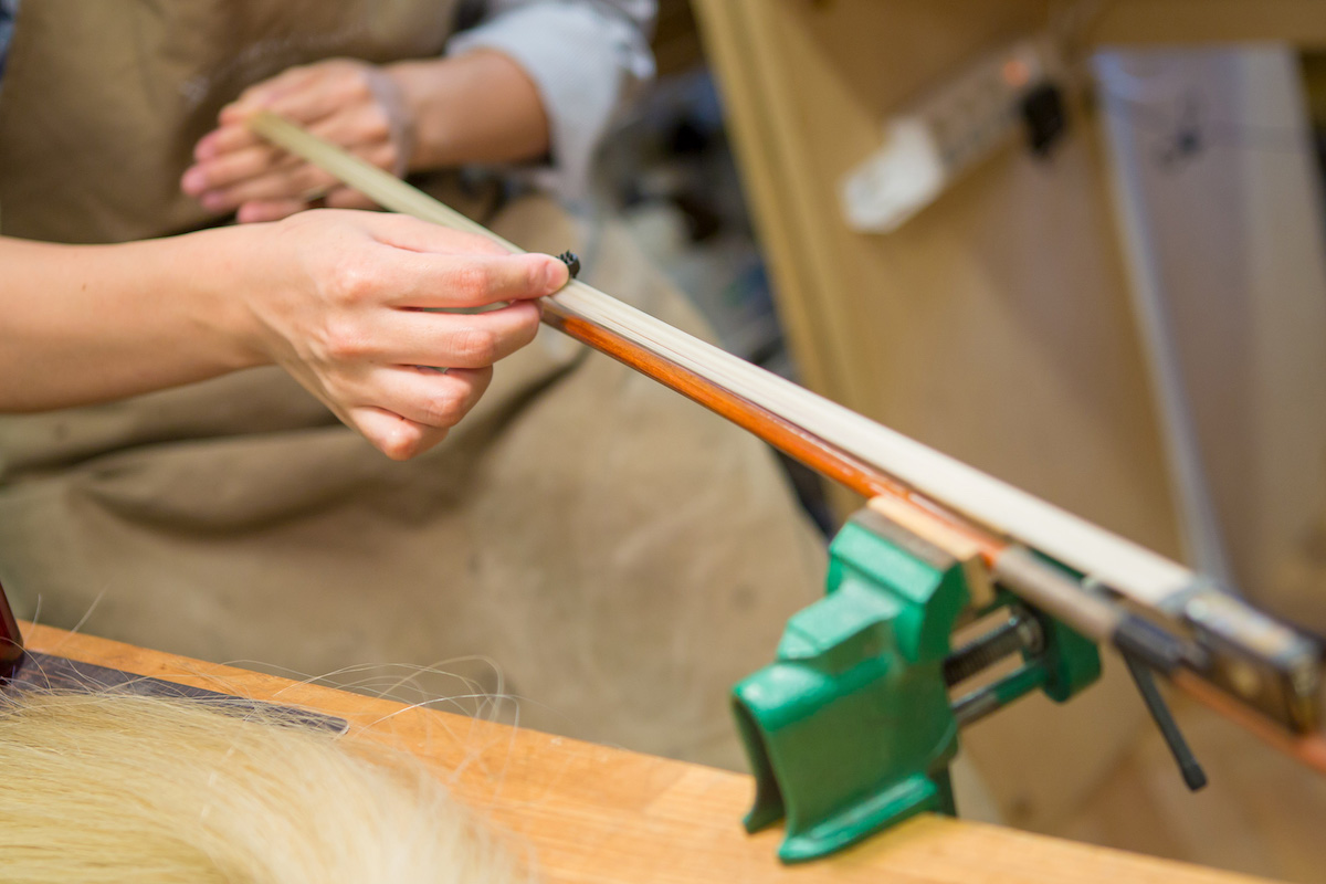 我們在遵守修理原則的基礎上,認為弓毛更換不單單只是保養工作而已,而是與顧客進行溝通的寶貴機會。無論您是期待實現平滑、偏澀、還是二者取中的彈奏手感,敬請隨時向我們反映您的具體需求。為了令顧客能夠感受到最為美妙的彈奏效果,我們會在充分了解顧客對於音量、音色的需求的同時,對毛質、毛量及弓毛安裝方式等進行反復權衡,方才開展作業。