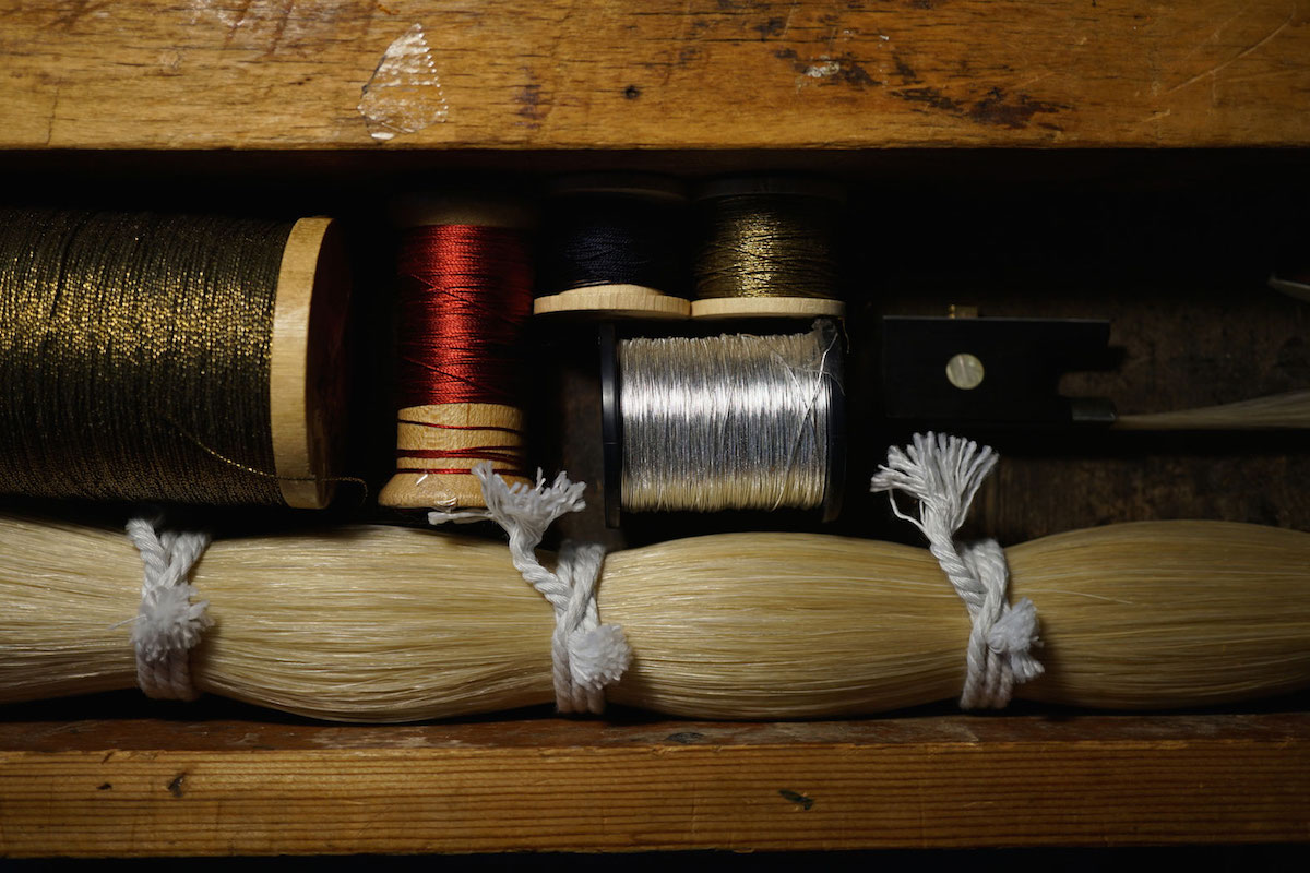 從尾庫位置觀察弓毛的話,小提琴、中提琴是從左至右,大提琴、低音大提琴是從右至左改變弓毛的張力。這樣僅通過語言的描述貌似簡單,實際上梳理及捆紮弓毛的手法全憑微妙的感觸,需要有嫻熟的技術為後盾。
